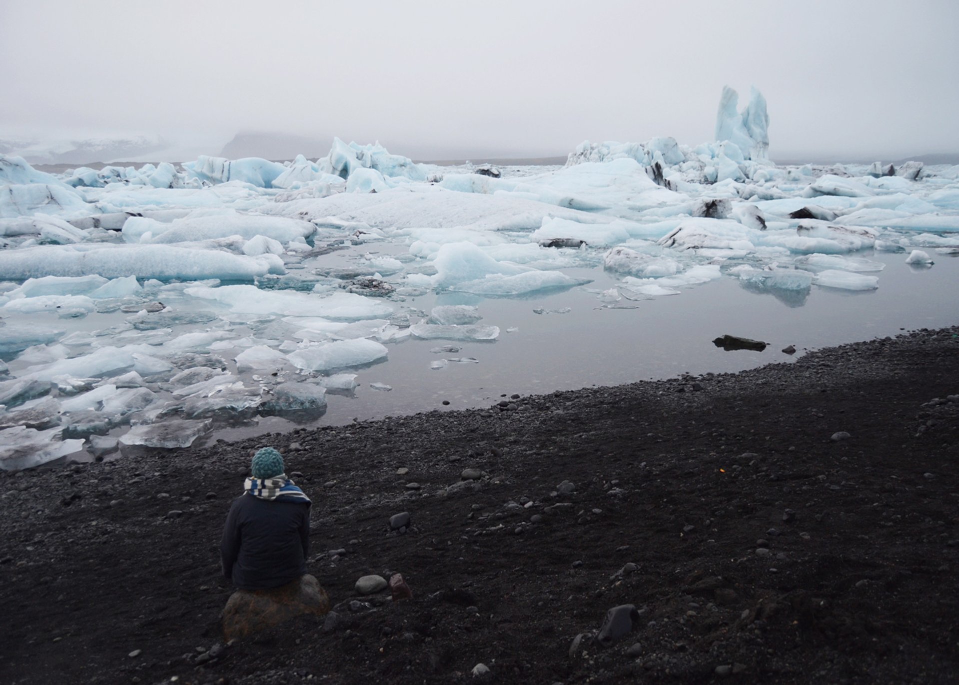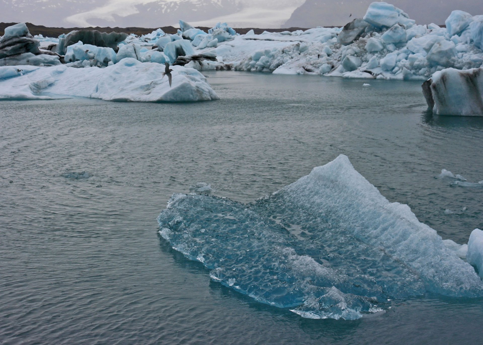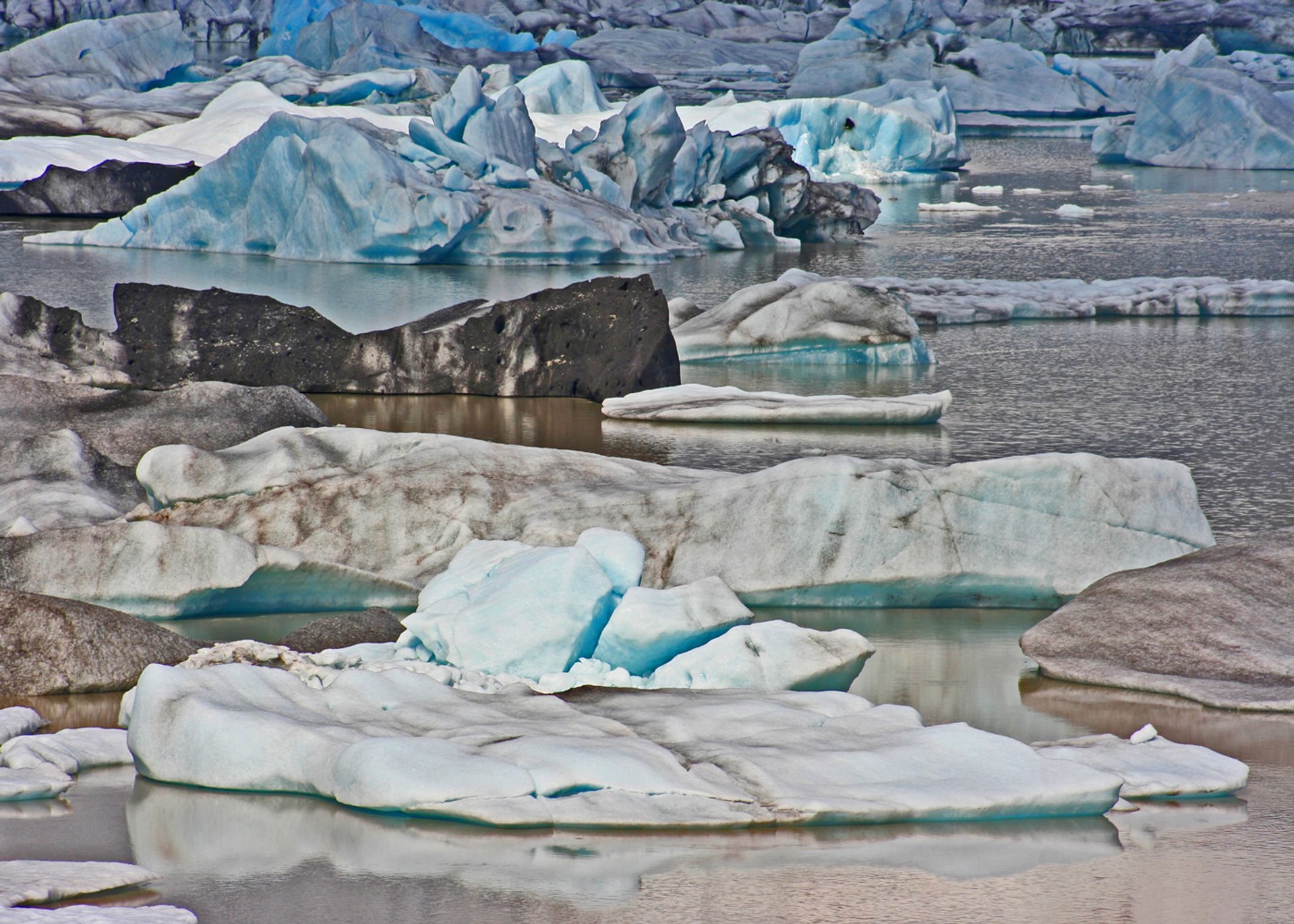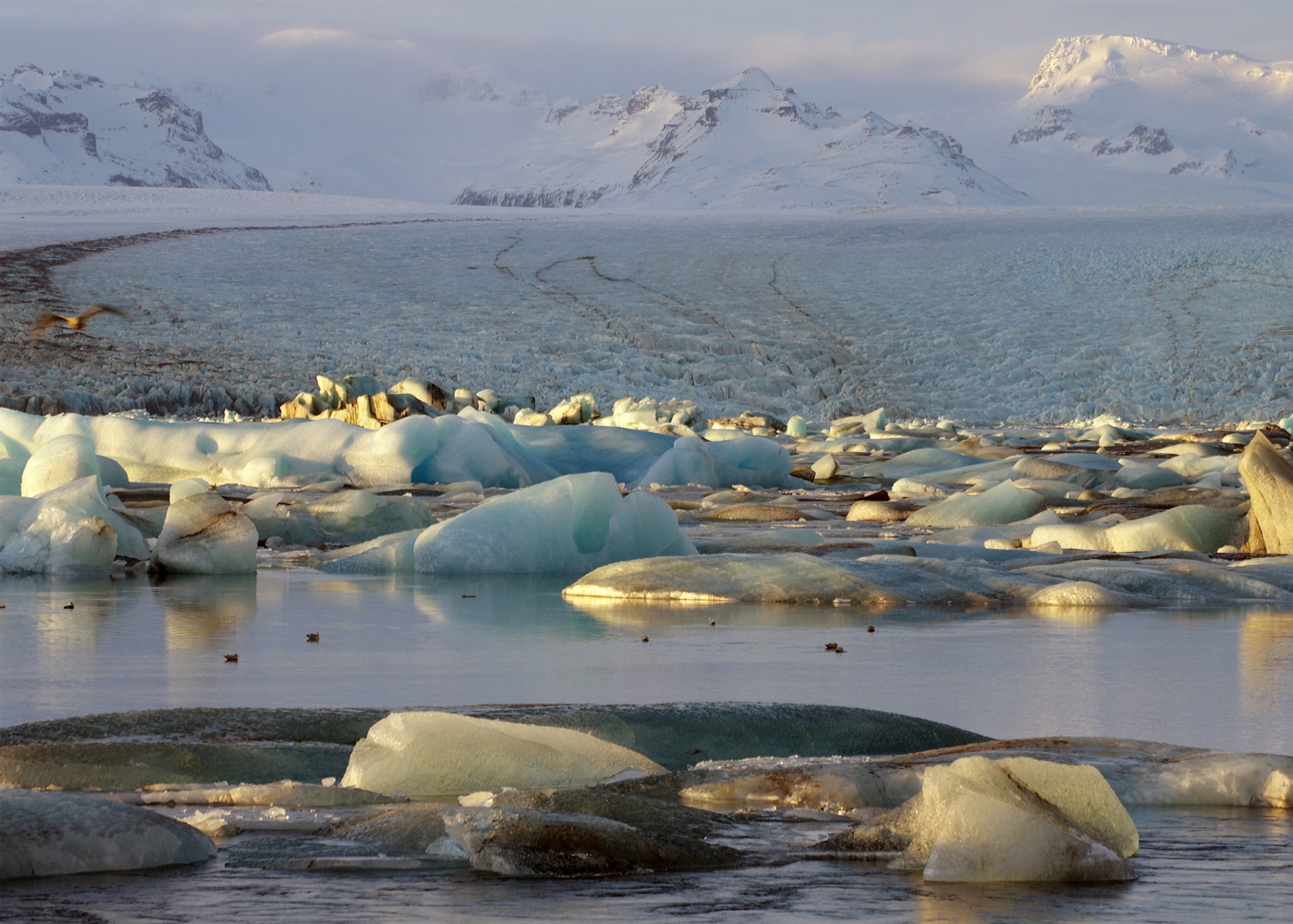 Eine der Gletscherzungen des Plateaugletschers kalbt unterschiedlich farbig schimmernde Eisberge in den großen See, der über einen Fluss direkt mit dem Meer verbunden ist. Die gekalbten, bis zu 15 Meter hohen Eisbrocken, können hier maximal vier Jahre verweilen, bis sie so weit und klein geschmolzen sind, dass sie durch den Fluss ins offene Meer des Nordatlantiks hinausgetragen werden können.