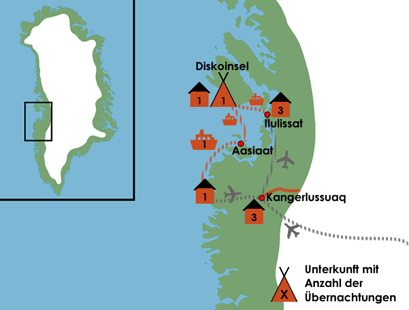 - An- und Abreise - Flug ab/bis Frankfurt/Main über Kopenhagen (Dänemark) mit Lufthansa sowie Flug ab/bis Kopenhagen(Dänemark) nach Kangerlussuaq (Grönland) und von Ilulissat mit Air Greenland