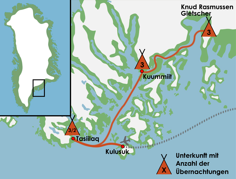 - An- und Abreise - ab/bis Frankfurt/Main oder München mit Umstieg in Keflavík/Island nach Kulusuk/Grönland und umgekehrt