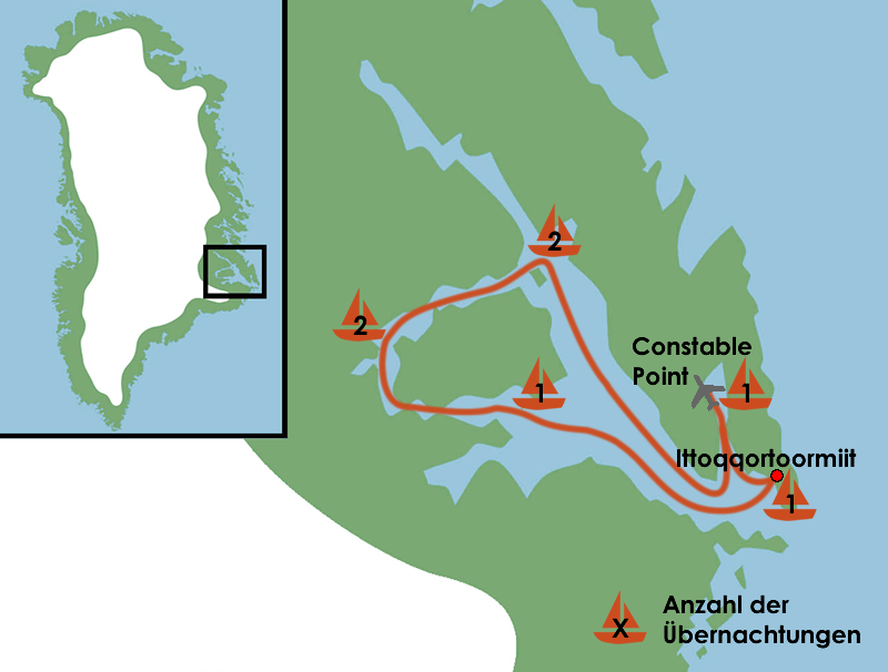 Reisecharakter … Auf dieser Segelreise in kleiner Gruppe mit maximal 12 Teilnehmern erkunden wir den Scoresbysund in Ost-Grönland. Wir treten die Reise mit einem dieser Segelschiffe an: Ópal, Tilvera oder Hildur. Das Fjordsystem führt uns durch verschiedene Wasserstraßen und entlang einzelner Inseln. Wir übernachten auf dem Segelschiff teils fernab der Zivilisation und lassen uns auf mehreren leichten bis mittelschweren Wanderungen mit Tagesgepäck von den jeweiligen Naturschönheiten zwischen Gletschern, Fjorden und majestätischen Eisbergen in den Bann ziehen. Um an Land zu gelangen, ist der Einsatz eines Zodiacs unverzichtbar. Aufgrund des intensiven Miteinanders an Bord des Segelschiffes und auf unseren aktiven Wanderungen trägt Teamgeist innerhalb der Gruppe, gegenseitige Toleranz und Offenheit gegenüber der einheimischen Natur und auch Kultur entscheidend zum Gelingen dieser Erlebnisreise bei. Ausgangs- und Endpunkt unserer Reise ist die Insel Island.