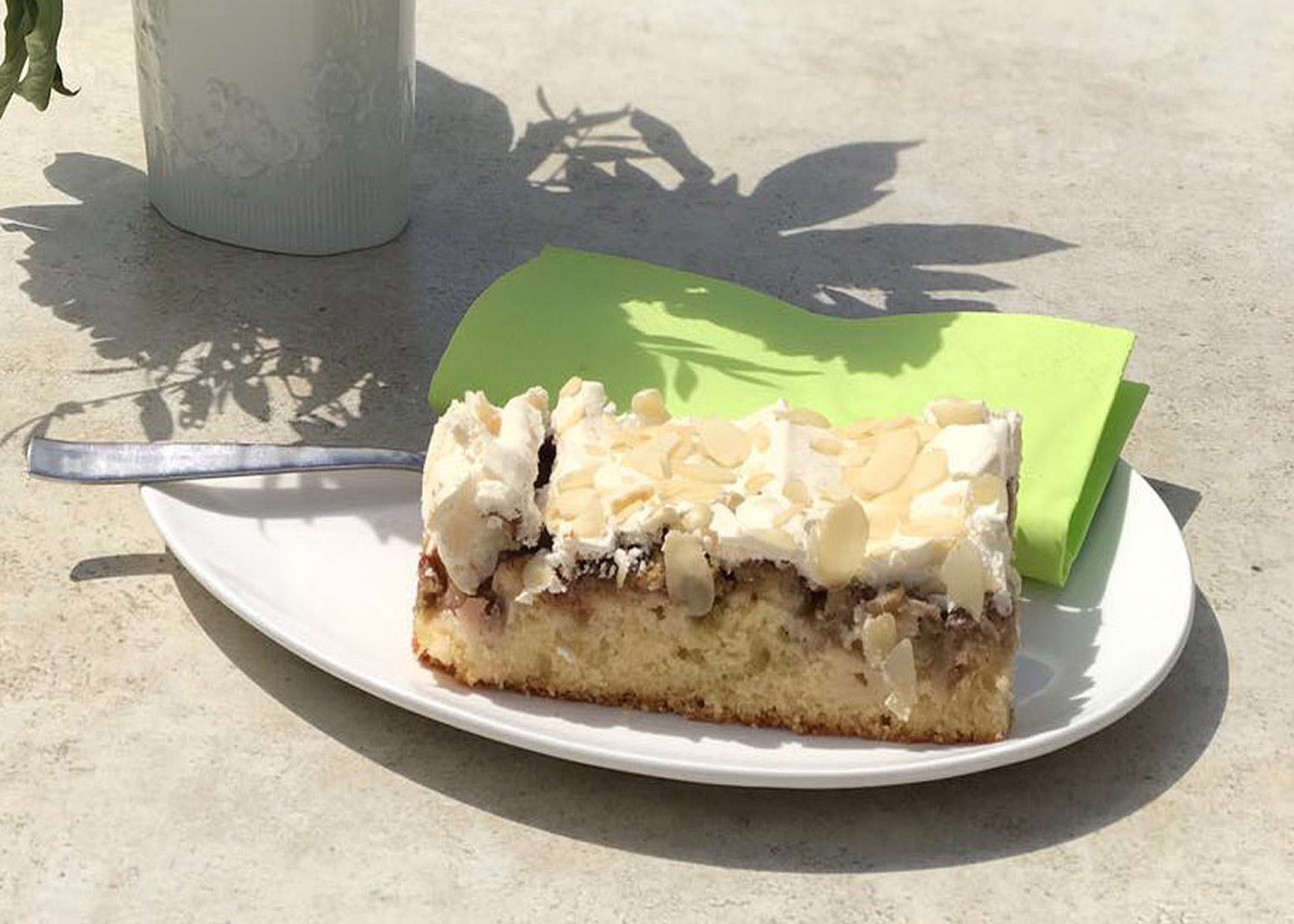 Der Kuchen an sich ist schon eine Delikatesse. Wir contrastraveler wollen wie immer das Maximum aus allem herausholen und peppen den klassischen Hjónabandssaela noch mit einer Schicht aus Baiser/Meringue und etwas Mandelsplitter on top auf. Die süße Baiser-Schicht ergänzt den leicht säuerlichen Geschmack des Rhabarbers ganz hervorragend. Jetzt noch etwas Sahne obenauf und dann heißt es für alle Feinschmecker: njóttu máltíð.