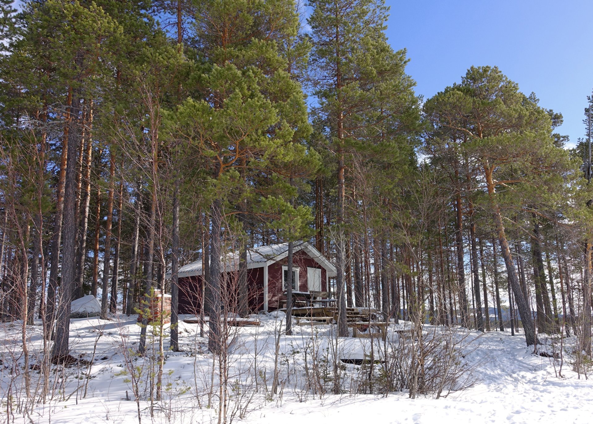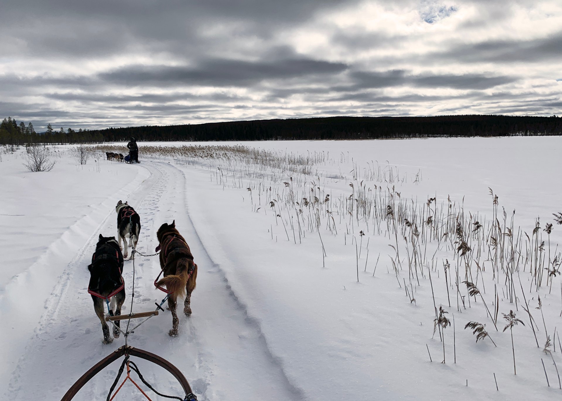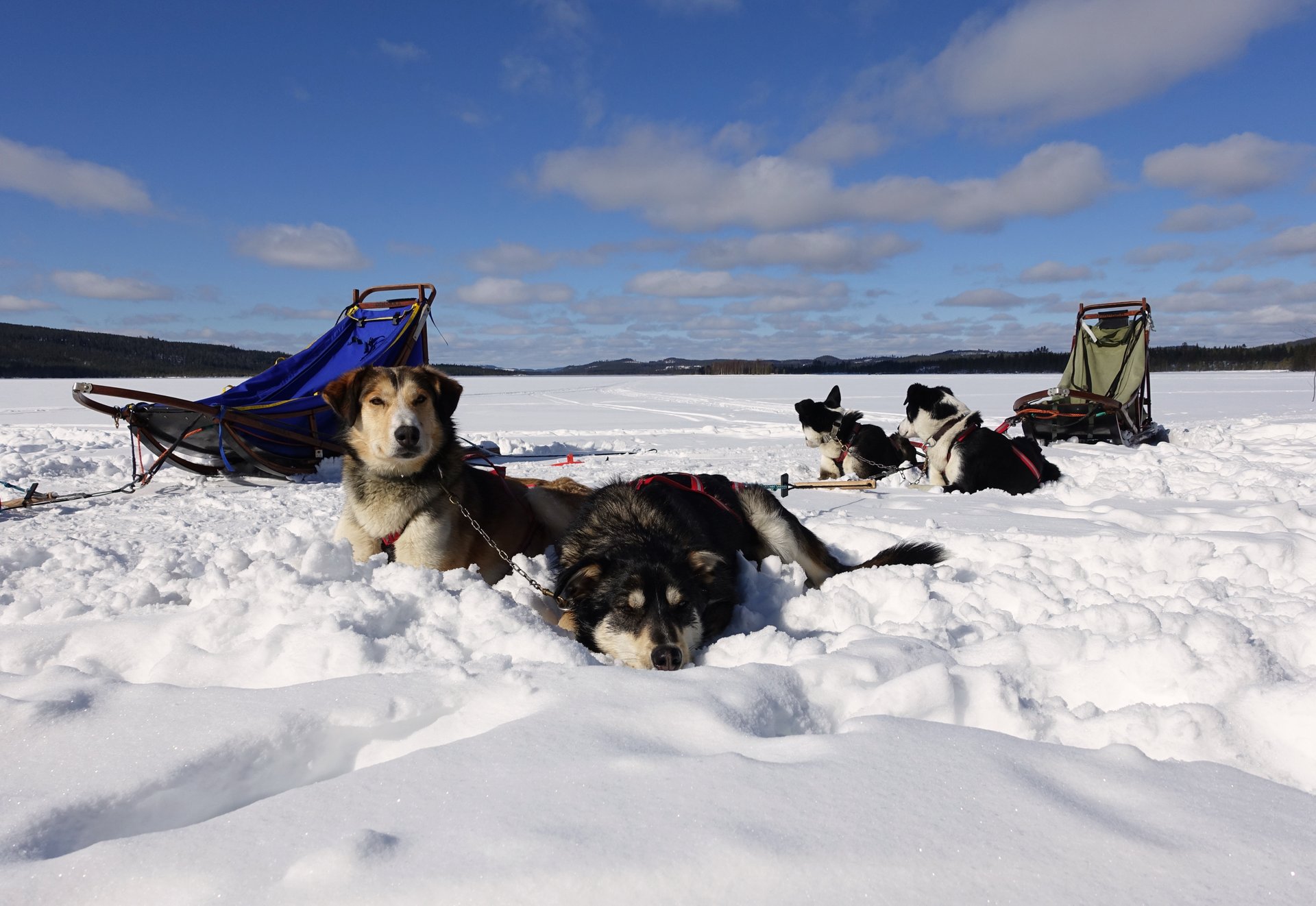 Wir gleiten über den weichen Schnee zwischen hohen Nadelbäumen in der wunderschönen Winterlandschaft Schwedisch-Lapplands. Sobald die Hunde anziehen, sind sie still und wir genießen die Ruhe, die die Landschaften ausstrahlen. Unser Ziel ist heute Nachmittag eine kleine Insel auf einem zugefrorenen See. Dort befindet sich eine kleine Hütte, in der wir die kommende Nacht verbringen. Wir machen unterwegs Halt und stärken uns bei einer kleinen Pause mit Lunchpaketen. Aber erstmal öffnet sich vor uns die Landschaft, als wir über eine kleine Neigung aus dem Wald heraus am Ufer des Sees entlangfahren. Da im Winter der See zugefroren ist, können wir einfach mit dem Schlitten bis zur Insel fahren. Dort erhalten die Hunde ihre verdiente Pause.