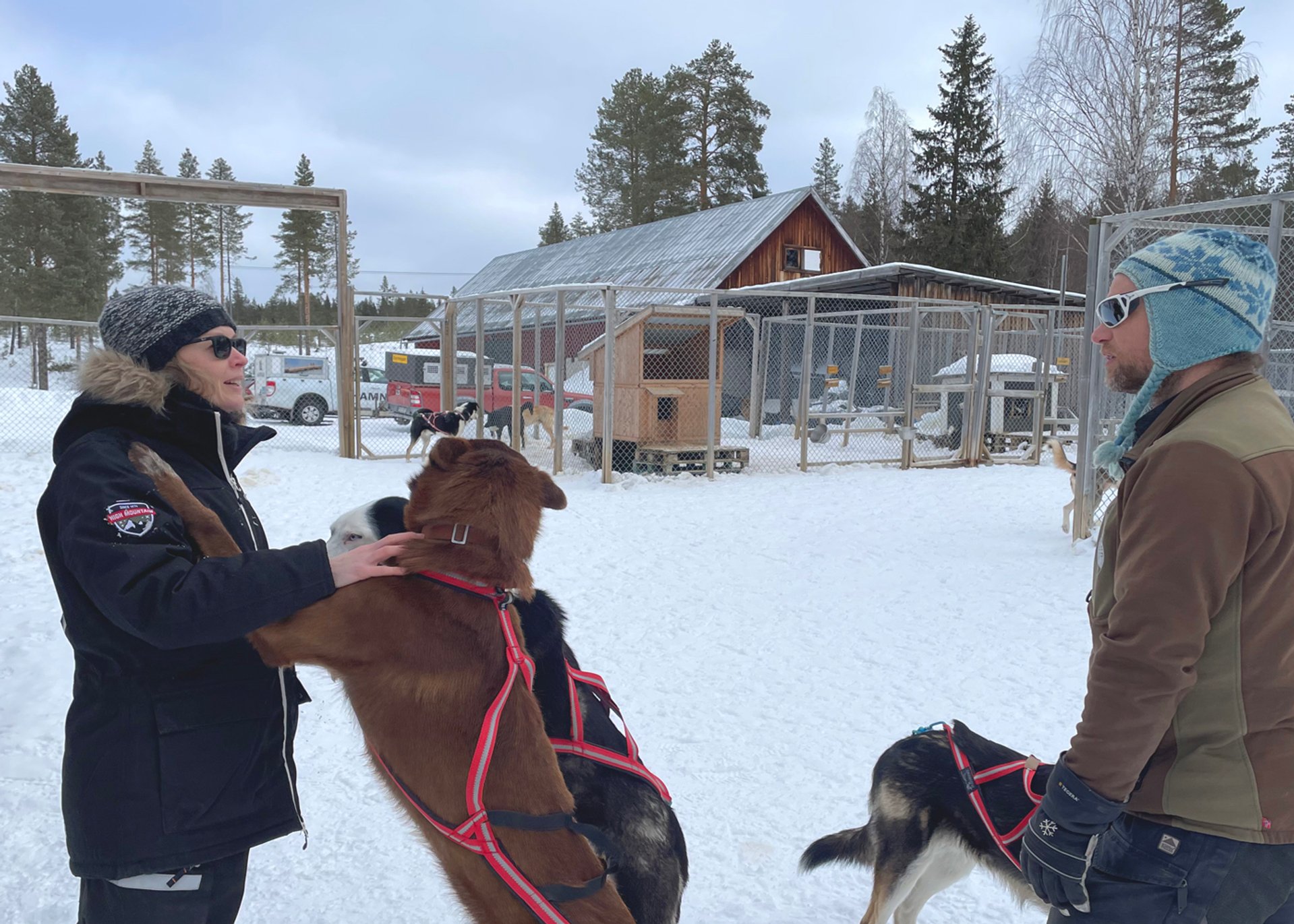 Der Schnee knirscht unter den Schuhen, die Hunde rennen aufgeregt um uns herum. Sie spüren, dass sie gleich los geht; die wohl schönste Hundeschlittenfahrt in Schwedisch-Lappland. Zuvor lernen wir den Besitzer Morgan kennen und merken sofort, dass er ein großes Herz für seine Hunde und die Umgebung hat, in der er mit ihnen unterwegs ist. Er zeigt uns, wie wir das Geschirr an die Hunde legen, um sie für die Hundeschlittenfahrt startklar zu machen. Zu zweit teilen wir uns einen Schlitten, eine Person lenkt den Schlitten und die andere Person sitzt vorne drin. Wir bekommen einen warmen Overall, im Schlitten liegen warme Rentierfelle, mit denen wir uns zusätzlich zudecken können. Sobald die Hunde im Geschirr sind, springen und heulen sie vor Aufregung. Sie können es kaum abwarten, bis wir sitzen und das Startzeichen gegeben wird.