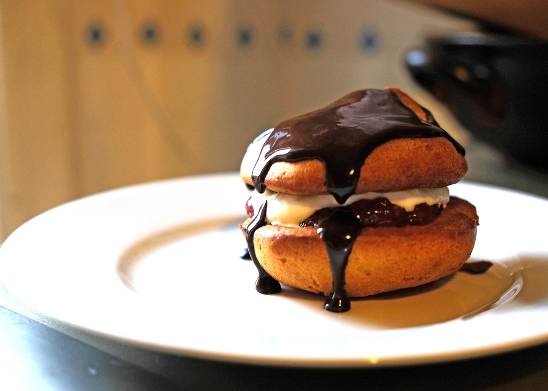 Die Marmelade und Schlagsahne zwischen die Hälften verteilen, die Schokolade erwärmen und über die Oberhälften verteilen.