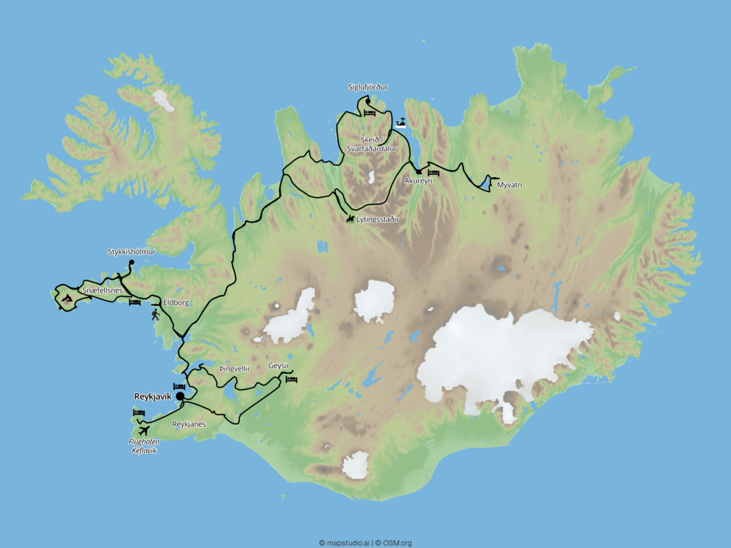- Programm-Details: Wanderungen & Spaziergänge wie beschrieben, Erkundungen auf Reykjanes mit einem Geologie-Experten, Besuch eines Geothermalkraftwerks, Bad im Thermalbad Hvammsvík, Treffen mit einem Ranger im Snæfellsjökull-Nationalpark, Besuch des Haifisch-Museumshofs Bjarnarhöfn, Besuch der Pferdefarm Lýtingsstaðir, Treffen der Einwanderin Myriam auf der Farm Skeið, Besuch des Heringsmuseums in Siglufjörður, Besuch einer Fischfabrik in Hauganes, Walbeobachtungstour im Eyjajörður