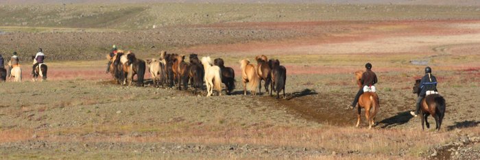 Reisecharakter … Auf dieser klassischen Strecken-Reittour durchqueren Sie das isländische Hochland auf der Hochlandstrecke Kjölur zu Pferde. Nach alter Tradition reiten wir mit einer freilaufenden Herde von Wechselpferden durch das unbewohnte, wilde Herz der Vulkaninsel, sodass eine Reihe von guten Reitpferden mit unterschiedlichen Eigenschaften zur Verfügung steht und für jeden Reitertyp passende Pferde ausgewählt werden können. Mit Blick auf Gletscher und Vulkane reiten wir durch weitläufige Steinwüsten und gewinnen auf unseren Tagesetappen einen unverfälschten Eindruck vom Reisen in vergangenen Zeiten. In Hveravellir bietet sich außerdem die Möglichkeit, unsere Muskeln nach den langen Reittagen in naturheißen Quellen zu entspannen (Badehose/-anzug nicht vergessen!). Unser Gepäck wird während der Reittour von einem Begleitfahrzeug zu den jeweiligen Unterkünften transportiert.