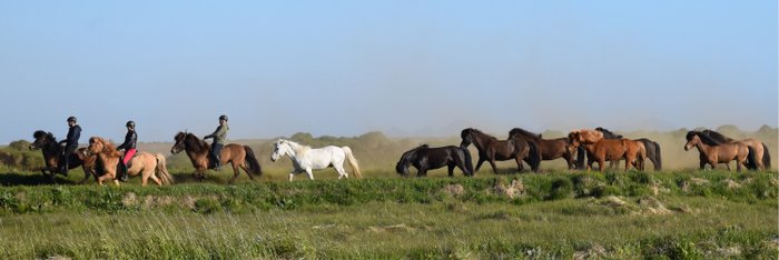 Begleiten Sie uns auf traditionellen Pfaden durch die Heimat der Islandpferde! Auf dieser Strecken-Reittour mit freilaufender Pferdeherde erkunden wir die natürliche Umgebung der „Wikingerpferde“ mit maximal 12 Teilnehmern. Wir tölten durch weitläufige Küstenlandschaft und machen uns mit Blick auf Gletscher und den Vulkan Hekla auf den Weg in einen wenig besuchten Teil des mystischen, südlichen Hochlands. Dabei durchstreifen wir violette Lupinen und weitläufige, schwarze Lavafelder, die an die Filmkulisse von „Der Herr der Ringe“ erinnern. Außerdem erwarten uns Flussdurchquerungen, Übernachtungen inmitten der „Wildnis“ des Hochlands, entspannte Abende mit typisch isländischen Gerichten und ein Abschiedsritt am schwarzen Strand. Eine authentische Reittour für Islandpferdefans mit fortgeschrittener Reiterfahrung im Rahmen einer kleinen Gruppe …