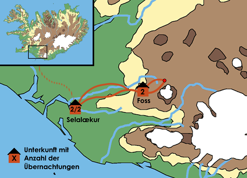 Gestärkt vom Frühstück fahren wir zu zurück zu unseren Pferde nach Stóra Hof. Wir freuen uns auf die zweite Etappe, denn heute geht es auf alten Wikingerpfaden in Richtung des mystischen Hochlands. Umgeben von alten Lavafeldern und violetten Lupinen bieten sich uns schöne Aussichten vom Pferderücken aus. Wir legen in der Nähe von Keldur – dem größten erhaltenen Torfhof in Südisland aus dem 12. bzw. 13. Jahrhundert – eine Pause ein. Auf einer Schotterpiste, die uns bis zu unserer Unterkunft, der Hochlandhütte Foss, führt. Hier, am Flussufer des Gletscherstroms Eystri-Rangá, verbringen wir die kommenden drei Nächte im ruhigen Inland Islands … Reiten: ca. 20km … ÜN Südliches Hochland/Foss