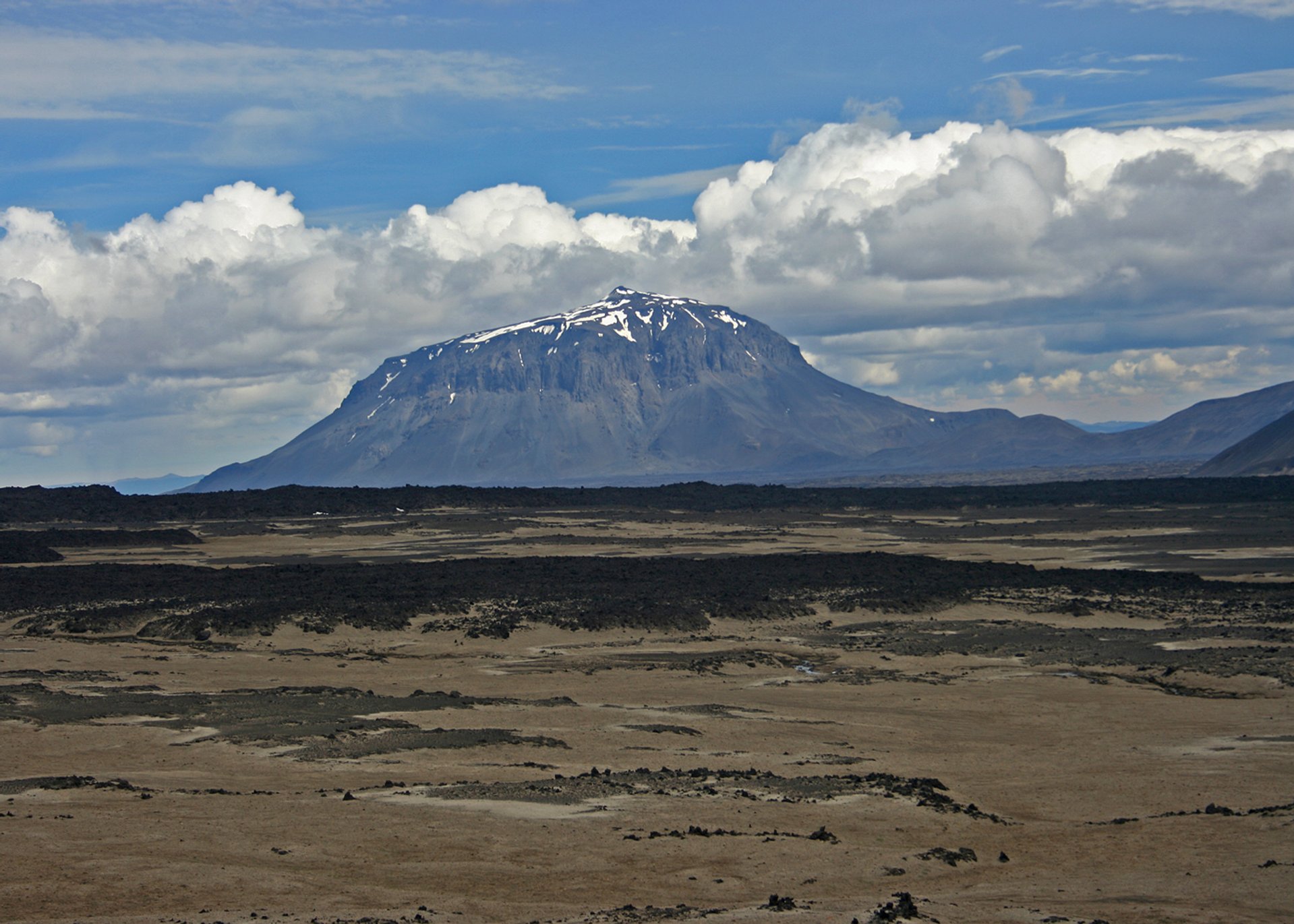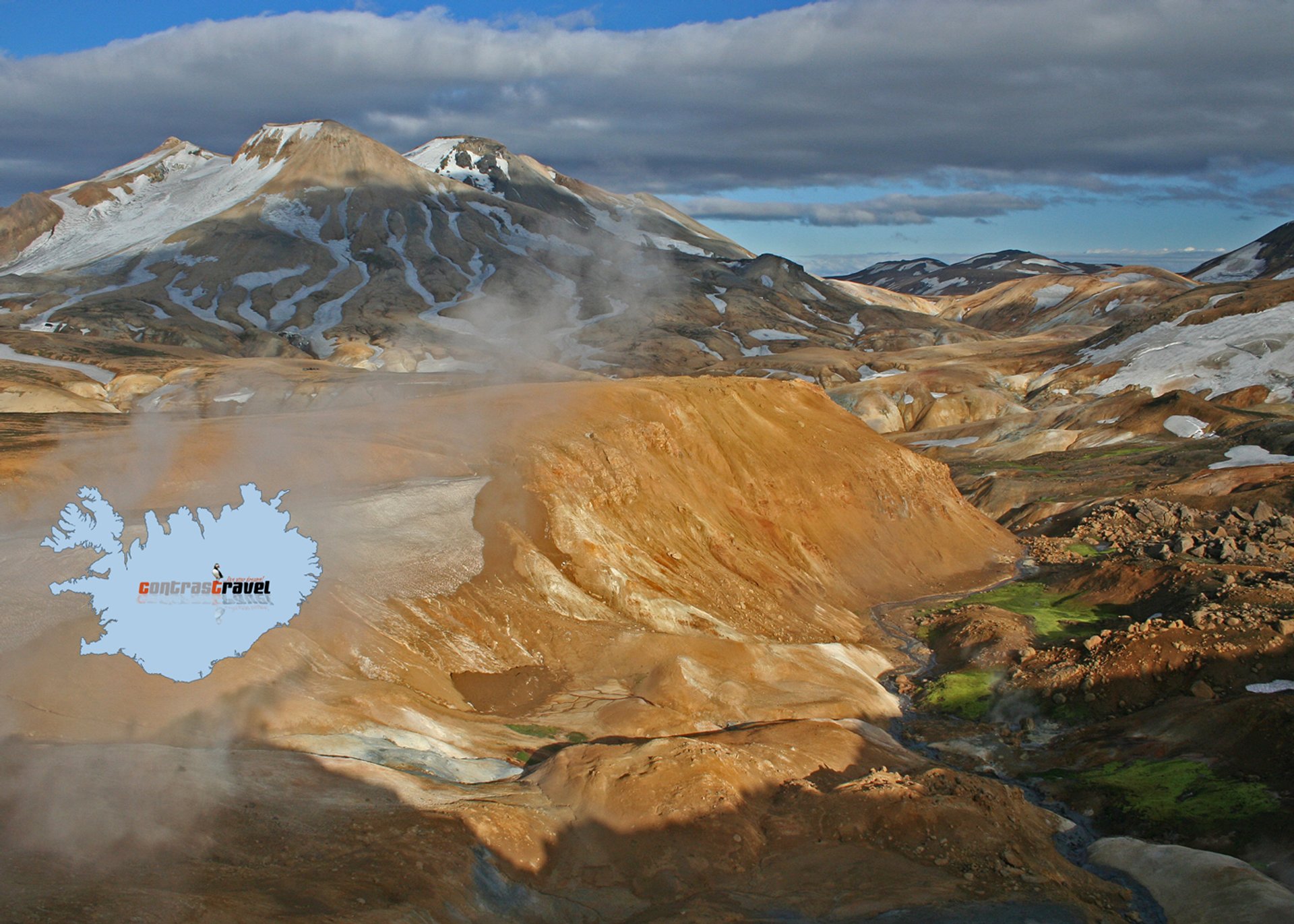 Diese Bergkette umfasst etwa 100 Quadratkilometer und ist vulkanischen Ursprungs. Bei Vulkanausbrüchen unter dem Eis eines Gletschers – vermutlich des Hofsjökull - entstand die heutige Tafelvulkan-Form der Gipfel aus Rhyolithgestein. Der Snækollur ist mit 1477 Metern der höchste von ihnen. Hier befindet sich auch eines der größten Hochtemperaturgebiete Islands, das Hveradalir. Wie bei Hveravellir auch dampft und zischt es hier an vielen Stellen. Der Kontrast zwischen gelblich-rötlichem Gestein, den hellen Schneefeldern und dem zarten Grün, das sich an manchen Stellen dank der ungewöhnlichen Wärme angesiedelt hat, bietet einen faszinierenden Anblick und unendliche Fotomotive. Auch der Temperaturengegensatz ist nicht zu unterschätzen – direkt neben Schnee und Eis brodeln Schlammtöpfe und heiße Bäche, der Boden selbst kann 80 bis 100°C warm sein. Daher sollte man unbedingt auf den vorgegebenen Wegen bleiben, wenn man es zum Schutz der Landschaft nicht ohnehin schon tut. Doch die Hitze aus dem Boden hat auch etwas Gutes: es gibt tatsächlich eine Bademöglichkeit in dieser abgelegenen Mondlandschaft.