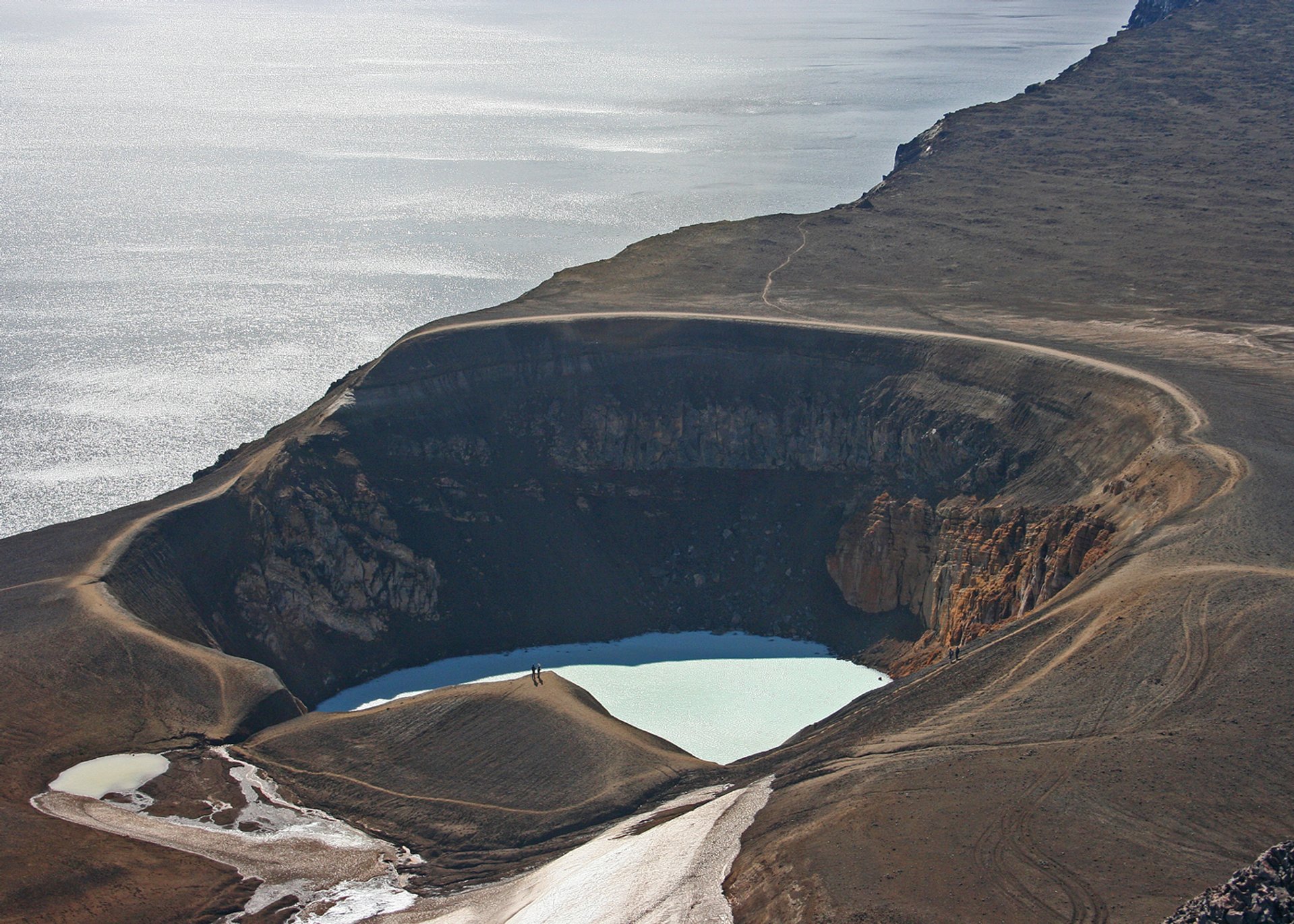 Die Askja (wörtlich „Schachtel“, in geologischem Kontext „Caldera“) bezeichnet den Zentralvulkan sowie das gleichnamige Vulkansystem, das sich über 200 Kilometer zieht und mittlerweile zum Vatnajökull-Nationalpark gehört. Sie besteht aus insgesamt drei Calderen, die ineinander verschachtelt sind und bei unterschiedlichen Ausbrüchen entstanden. Allgemein erhebt sich der Vulkan rund 800 Meter über die Hochebenen der Umgebung und erreicht eine maximale Gesamthöhe von 1510 Metern. Ein Muss bei einem Besuch der Gegend sind der See Öskjuvatn, der sich in der jüngsten Caldera gebildet hat und eine beeindruckende Tiefe von 220 Metern erreicht, sowie der Krater Víti, der direkt an den größeren See angrenzt und in dem sich ebenfalls Wasser gesammelt hat. Wer sich traut, kann hier bei Temperaturen von meist 20 bis 30°C ein Bad nehmen, allerdings ist der Weg zum See hin eher rutschig und man sollte genügend Zeit mitbringen. Ganz in der Nähe lockt auch die „Drachenschlucht“ Drekagil mit ihren geheimnisvollen Felsformationen und einem Wasserfall an ihrem Ende.